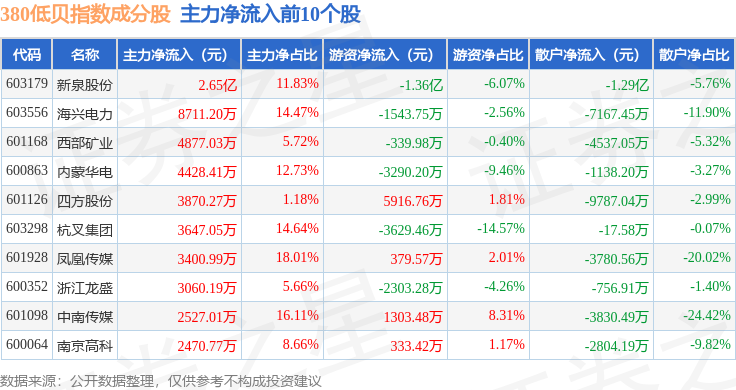 资金流向方面,380低贝(000138)指数成份股当日主力资金净流出合计4.02亿元,游资资金净流入合计5387.61万元,散户资金净流入合计3.48亿元。成份股资金流向详情见下表: