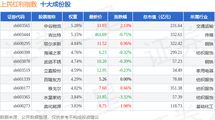 证券之星消息,11月6日,上民红利(000153)指数报收于3212.77点,涨0.16%,成交52.96亿元,换手率1.2%。当日该指数成份股中,上涨的有15家,梅花生物以2.39%的涨幅领涨,下跌的有12家,水星家纺以3.32%的跌幅领跌。