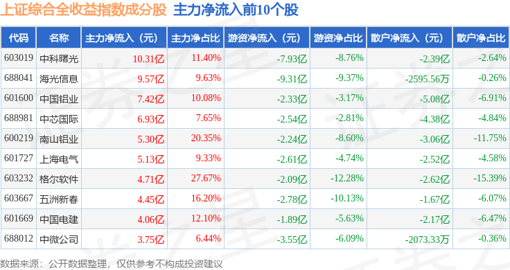 资金流向方面,上证综合全收益(000888)指数成份股当日主力资金净流入合计21.53亿元,游资资金净流出合计71.46亿元,散户资金净流入合计49.93亿元。成份股资金流向详情见下表: