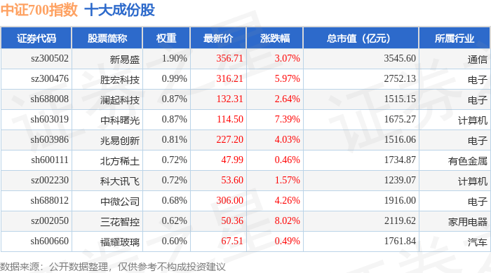 证券之星消息,11月6日,中证700(000907)指数报收于6460.65点,涨1.76%,成交6479.2亿元,换手率1.68%。当日该指数成份股中,上涨的有498家,中国铝业以10.03%的涨幅领涨,下跌的有177家,芒果超媒以5.29%的跌幅领跌。