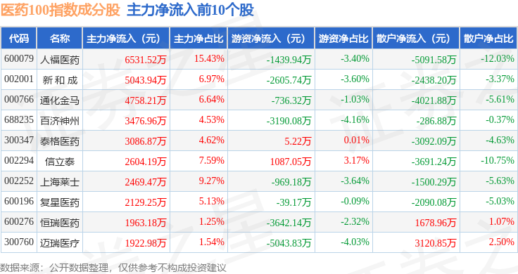 资金流向方面,医药100(000978)指数成份股当日主力资金净流出合计12.08亿元,游资资金净流入合计1.99亿元,散户资金净流入合计10.09亿元。成份股资金流向详情见下表: