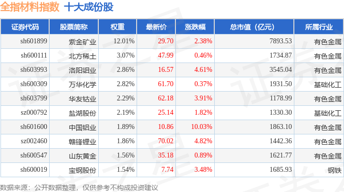 证券之星消息,11月6日,全指材料(000987)指数报收于4570.71点,涨2.76%,成交1500.0亿元,换手率2.0%。当日该指数成份股中,上涨的有143家,中国铝业以10.03%的涨幅领涨,下跌的有17家,四川双马以2.88%的跌幅领跌。