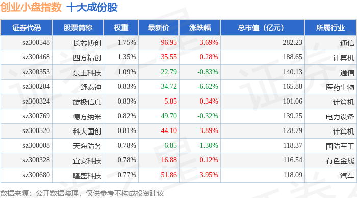 证券之星消息,11月6日,创业小盘(399020)指数报收于1740.58点,涨0.45%,成交783.36亿元,换手率3.96%。当日该指数成份股中,上涨的有161家,汉宇集团以17.4%的涨幅领涨,下跌的有131家,江龙船艇以7.67%的跌幅领跌。