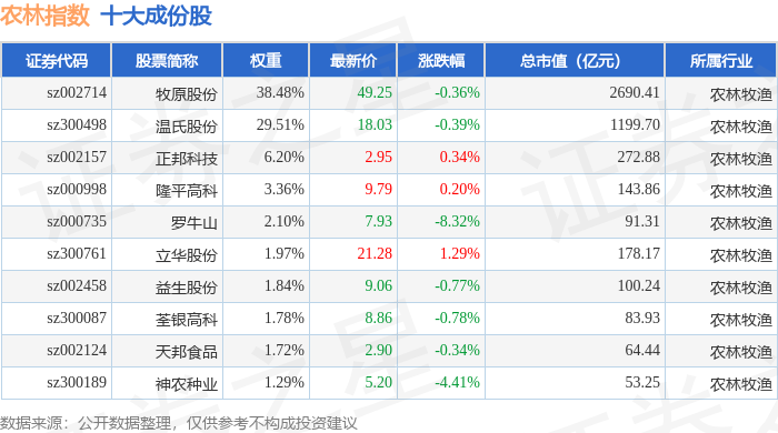农林指数(399231)十大成份股详情如下: