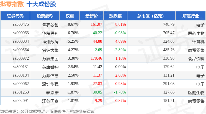 批零指数(399236)十大成份股详情如下: