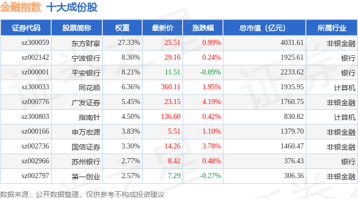 证券之星消息,11月6日,金融指数(399240)报收于1689.11点,涨1.02%,成交289.38亿元,换手率1.13%。当日该指数成份股中,上涨的有23家,东北证券以6.79%的涨幅领涨,下跌的有10家,海德股份以3.74%的跌幅领跌。