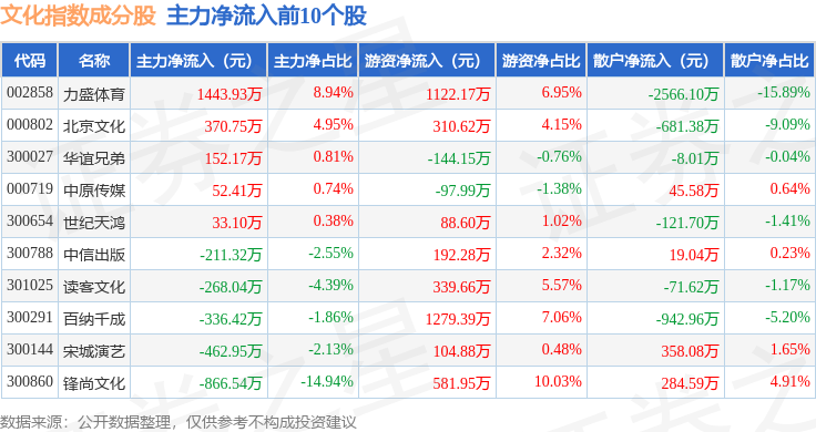 资金流向方面,文化指数(399248)成份股当日主力资金净流出合计8.58亿元,游资资金净流入合计1.07亿元,散户资金净流入合计7.51亿元。成份股资金流向详情见下表: