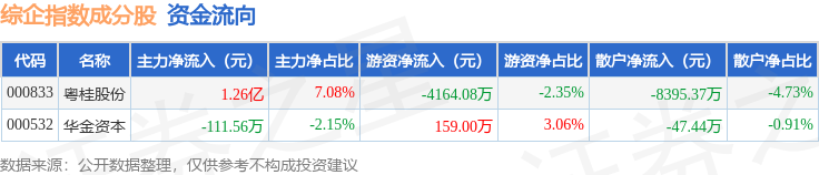 资金流向方面,综企指数(399249)成份股当日主力资金净流入合计1.24亿元,游资资金净流出合计4005.07万元,散户资金净流出合计8442.81万元。成份股资金流向详情见下表: