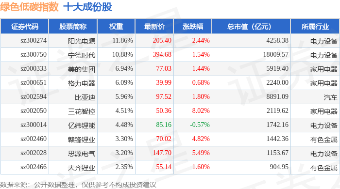 证券之星消息,11月6日,绿色低碳(399258)指数报收于4672.28点,涨1.91%,成交1226.13亿元,换手率2.11%。当日该指数成份股中,上涨的有40家,三花智控以8.02%的涨幅领涨,下跌的有10家,多氟多以1.39%的跌幅领跌。