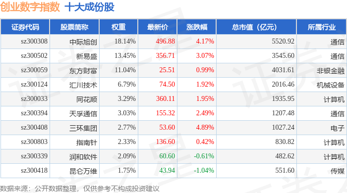 创业数字(399263)指数十大成份股详情如下: