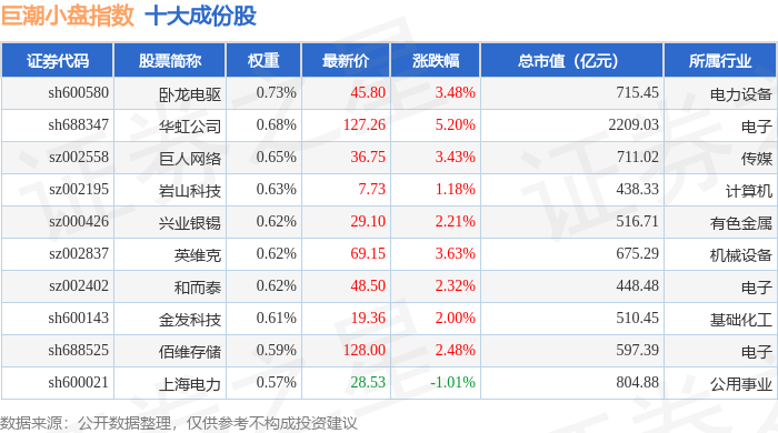 证券之星消息,11月6日,巨潮小盘(399316)指数报收于5920.47点,涨1.23%,成交2921.01亿元,换手率1.99%。当日该指数成份股中,上涨的有325家,三角防务以20.01%的涨幅领涨,下跌的有155家,卫宁健康以10.38%的跌幅领跌。