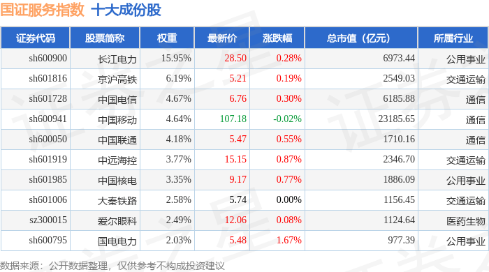 证券之星消息,11月6日,国证服务(399320)指数报收于2238.82点,涨0.33%,成交422.45亿元,换手率0.67%。当日该指数成份股中,上涨的有62家,大唐发电以4.07%的涨幅领涨,下跌的有34家,海峡股份以7.66%的跌幅领跌。