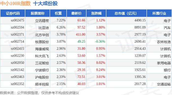 证券之星消息,11月6日,中小100R(399333)指数报收于10014.05点,涨1.85%,成交1319.97亿元,换手率1.49%。当日该指数成份股中,上涨的有75家,东山精密以10.0%的涨幅领涨,下跌的有23家,百润股份以2.53%的跌幅领跌。