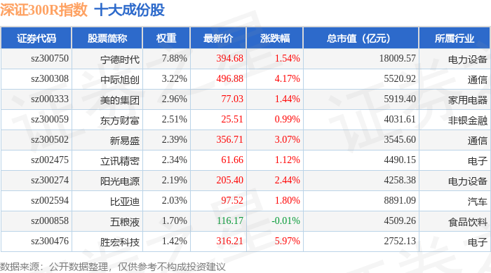 深证300R(399344)指数十大成份股详情如下: