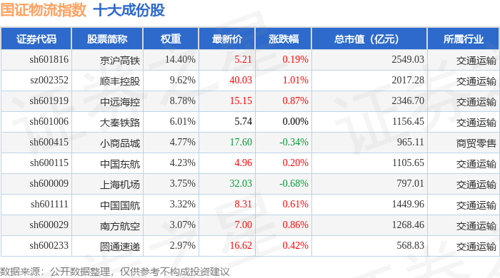 证券之星消息,11月6日,国证物流(399353)指数报收于2148.39点,涨0.35%,成交115.56亿元,换手率0.46%。当日该指数成份股中,上涨的有23家,恒逸石化以2.92%的涨幅领涨,下跌的有14家,永辉超市以1.07%的跌幅领跌。