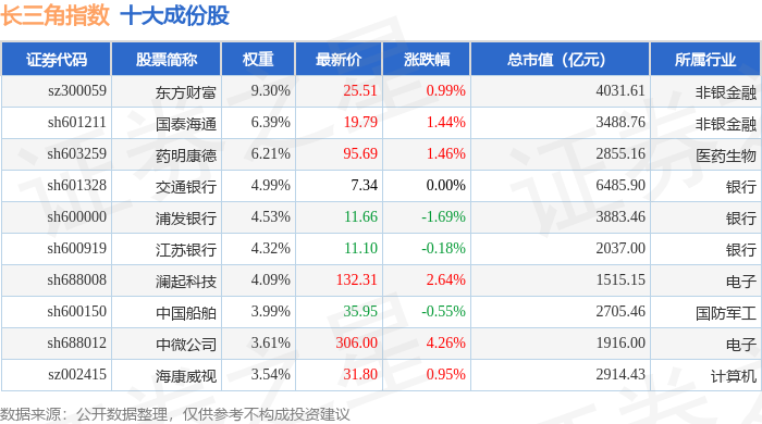 长三角(399355)指数十大成份股详情如下: