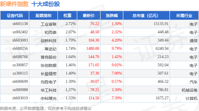 证券之星消息,11月6日,新硬件(399360)指数报收于7724.42点,涨1.58%,成交1303.61亿元,换手率2.2%。当日该指数成份股中,上涨的有79家,寒武纪以9.79%的涨幅领涨,下跌的有18家,达实智能以3.91%的跌幅领跌。