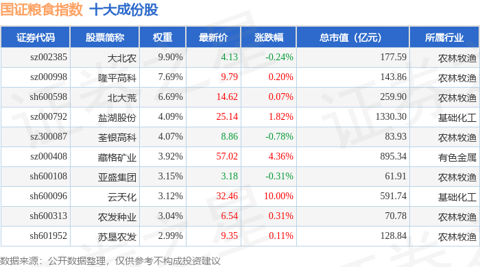证券之星消息,11月6日,国证粮食(399365)指数报收于13082.34点,涨1.12%,成交239.27亿元,换手率2.38%。当日该指数成份股中,上涨的有31家,云天化以10.0%的涨幅领涨,下跌的有15家,神农种业以4.41%的跌幅领跌。
