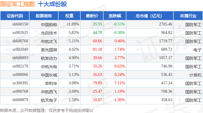 证券之星消息,11月6日,国证军工(399368)指数报收于7737.73点,涨1.07%,成交311.83亿元,换手率1.43%。当日该指数成份股中,上涨的有37家,三角防务以20.01%的涨幅领涨,下跌的有12家,中国卫通以1.19%的跌幅领跌。