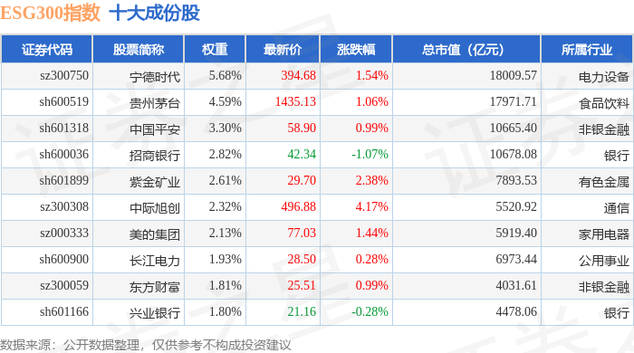 证券之星消息,11月6日,ESG300(399378)指数报收于2946.06点,涨1.4%,成交4563.69亿元,换手率0.78%。当日该指数成份股中,上涨的有207家,中国铝业以10.03%的涨幅领涨,下跌的有82家,芒果超媒以5.29%的跌幅领跌。