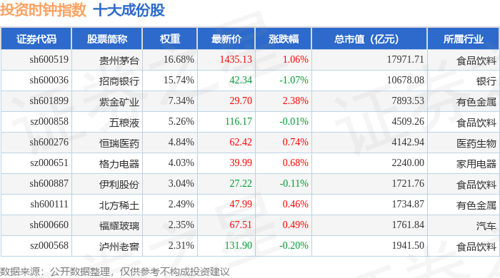 证券之星消息,11月6日,投资时钟(399391)指数报收于3370.56点,涨0.67%,成交792.39亿元,换手率0.85%。当日该指数成份股中,上涨的有51家,中国铝业以10.03%的涨幅领涨,下跌的有46家,大连圣亚以9.99%的跌幅领跌。