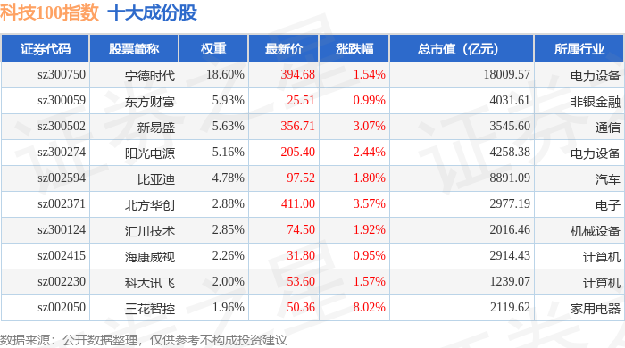 科技100(399608)指数十大成份股详情如下: