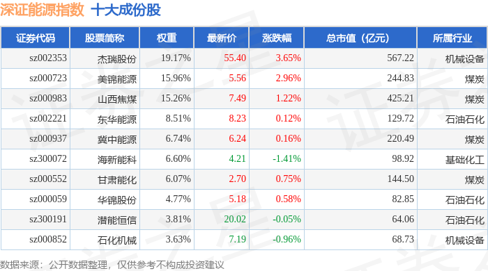 证券之星消息,11月6日,深证能源(399613)指数报收于3362.73点,涨1.31%,成交47.06亿元,换手率2.67%。当日该指数成份股中,上涨的有7家,杰瑞股份以3.65%的涨幅领涨,下跌的有6家,海新能科以1.41%的跌幅领跌。