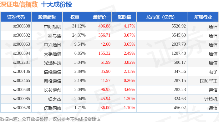深证电信(399621)指数十大成份股详情如下: