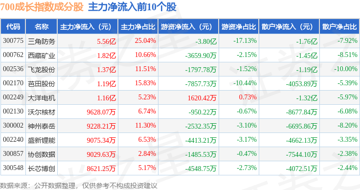 资金流向方面,700成长(399628)指数成份股当日主力资金净流入合计6.42亿元,游资资金净流出合计4.37亿元,散户资金净流出合计2.05亿元。成份股资金流向详情见下表: