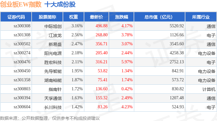 创业板EW(399635)指数十大成份股详情如下: