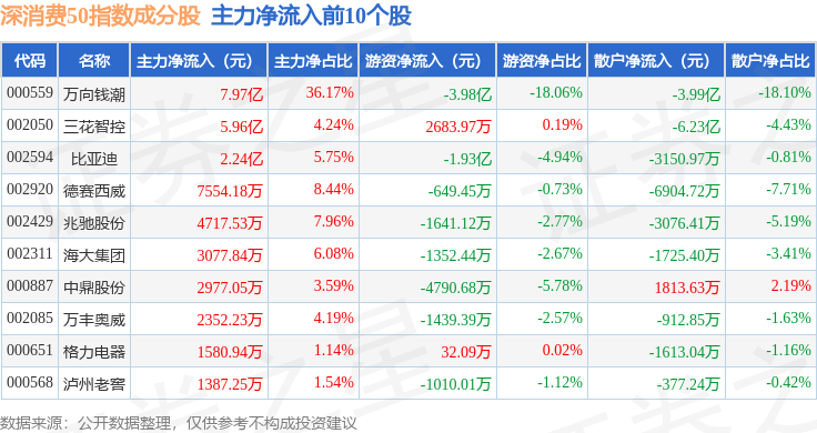 资金流向方面,深消费50(399646)指数成份股当日主力资金净流出合计5598.58万元,游资资金净流出合计4.68亿元,散户资金净流入合计5.24亿元。成份股资金流向详情见下表: