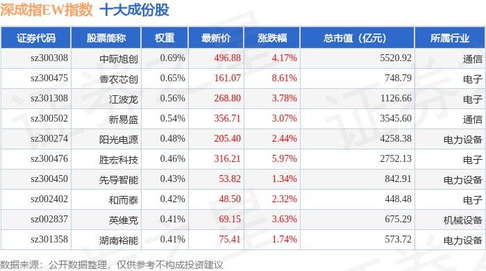证券之星消息,11月6日,深成指EW(399659)指数报收于4666.09点,涨1.48%,成交5389.27亿元,换手率1.86%。当日该指数成份股中,上涨的有352家,三角防务以20.01%的涨幅领涨,下跌的有136家,卫宁健康以10.38%的跌幅领跌。