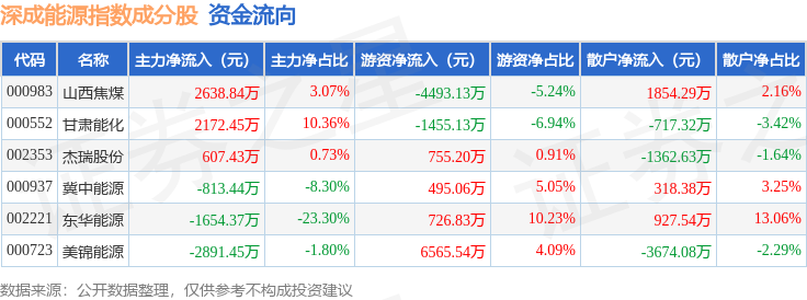 资金流向方面,深成能源(399680)指数成份股当日主力资金净流入合计59.45万元,游资资金净流入合计2594.38万元,散户资金净流出合计2653.82万元。成份股资金流向详情见下表: