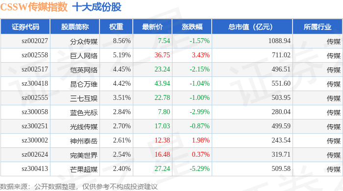 证券之星消息,11月6日,CSSW传媒(399810)指数报收于3114.51点,跌1.3%,成交459.53亿元,换手率3.7%。当日该指数成份股中,上涨的有10家,巨人网络以3.43%的涨幅领涨,下跌的有87家,粤传媒以9.96%的跌幅领跌。