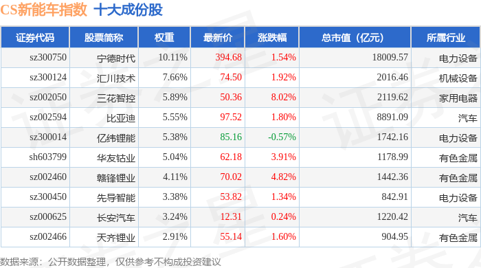 CS新能车(399976)指数十大成份股详情如下:
