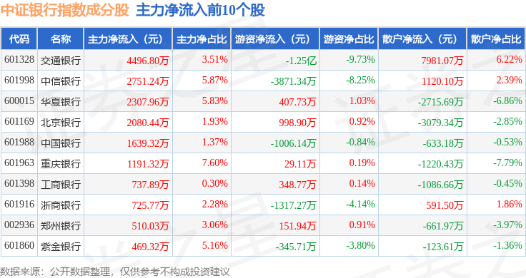 资金流向方面,中证银行(399986)指数成份股当日主力资金净流出合计13.85亿元,游资资金净流入合计1.4亿元,散户资金净流入合计12.45亿元。成份股资金流向详情见下表: