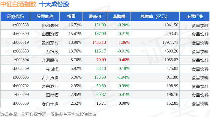 证券之星消息,11月6日,中证白酒(399997)指数报收于9599.51点,跌0.05%,成交113.68亿元,换手率0.57%。当日该指数成份股中,上涨的有3家,贵州茅台以1.06%的涨幅领涨,下跌的有14家,迎驾贡酒以1.48%的跌幅领跌。