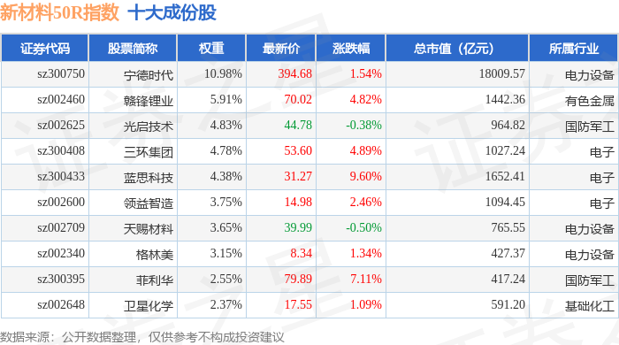 资金流向方面,新材料50R(470042)指数成份股当日主力资金净流入合计15.5亿元,游资资金净流出合计10.05亿元,散户资金净流出合计5.45亿元。成份股资金流向详情见下表: