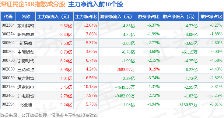 资金流向方面,深证民企50R(470057)指数成份股当日主力资金净流入合计54.66亿元,游资资金净流出合计25.21亿元,散户资金净流出合计29.45亿元。成份股资金流向详情见下表: