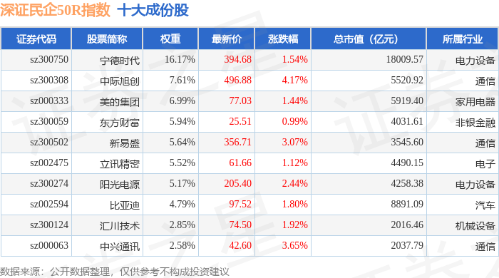 深证民企50R(470057)指数十大成份股详情如下: