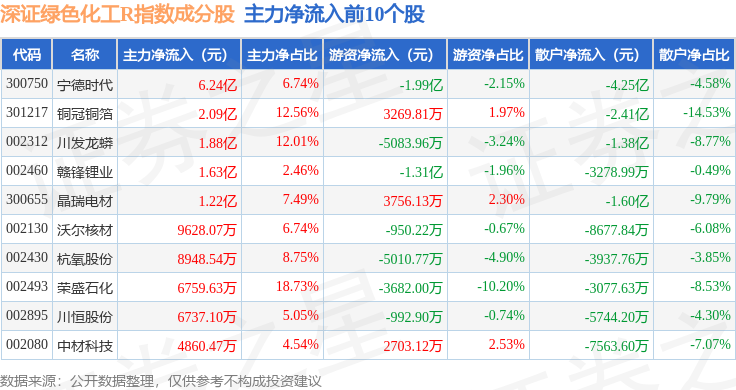 资金流向方面,深证绿色化工R(470076)指数成份股当日主力资金净流入合计14.04亿元,游资资金净流出合计4.27亿元,散户资金净流出合计9.77亿元。成份股资金流向详情见下表: