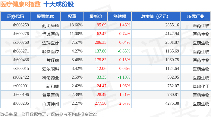 资金流向方面,医疗健康R(480016)指数成份股当日主力资金净流出合计3.28亿元,游资资金净流出合计8226.31万元,散户资金净流入合计4.1亿元。成份股资金流向详情见下表: