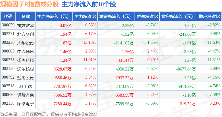 资金流向方面,规模因子R(480055)指数成份股当日主力资金净流入合计8.72亿元,游资资金净流出合计3.72亿元,散户资金净流出合计5.0亿元。成份股资金流向详情见下表: