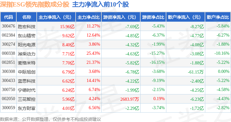 深指ESG领先(970029)指数十大成份股详情如下: