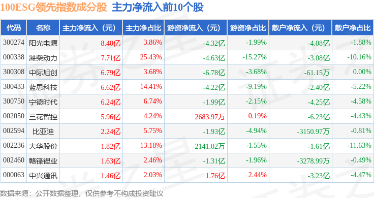 资金流向方面,100ESG领先(970030)指数成份股当日主力资金净流入合计39.57亿元,游资资金净流出合计21.86亿元,散户资金净流出合计17.71亿元。成份股资金流向详情见下表: