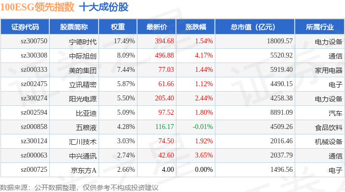 证券之星消息,11月6日,100ESG领先(970030)指数报收于6728.71点,涨1.85%,成交1426.15亿元,换手率1.2%。当日该指数成份股中,上涨的有38家,潍柴动力以10.01%的涨幅领涨,下跌的有10家,芒果超媒以5.29%的跌幅领跌。