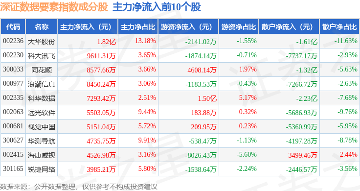 资金流向方面,深证数据要素(970053)指数成份股当日主力资金净流出合计8.46亿元,游资资金净流入合计3.59亿元,散户资金净流入合计4.87亿元。成份股资金流向详情见下表: