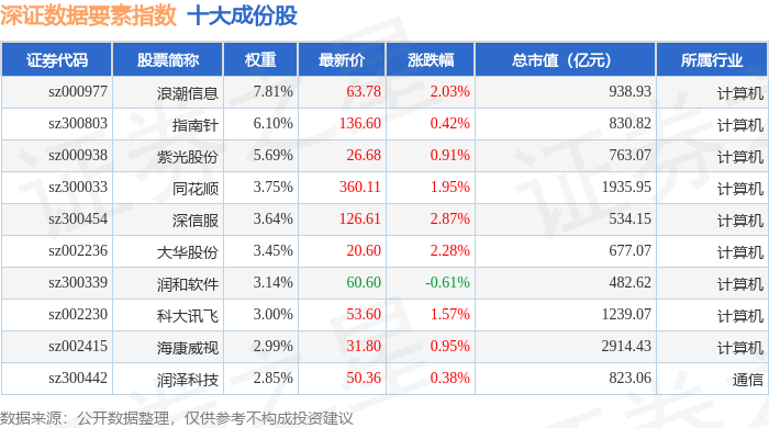 证券之星消息,11月6日,深证数据要素(970053)指数报收于3969.4点,涨0.31%,成交429.11亿元,换手率2.56%。当日该指数成份股中,上涨的有26家,锐捷网络以4.03%的涨幅领涨,下跌的有23家,卫宁健康以10.38%的跌幅领跌。