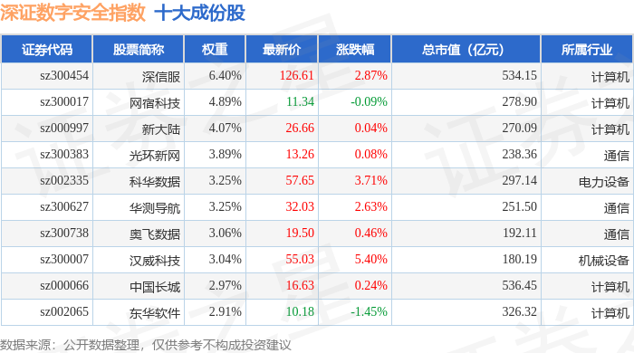 证券之星消息,11月6日,深证数字安全(970052)指数报收于3569.17点,涨0.38%,成交267.5亿元,换手率3.26%。当日该指数成份股中,上涨的有23家,汉威科技以5.4%的涨幅领涨,下跌的有27家,深城交以2.62%的跌幅领跌。