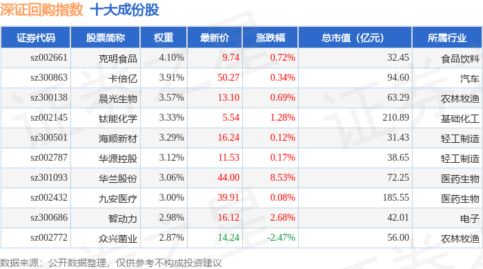 证券之星消息,11月6日,深证回购(970063)指数报收于2822.04点,涨1.31%,成交160.81亿元,换手率1.3%。当日该指数成份股中,上涨的有38家,万泽股份以9.99%的涨幅领涨,下跌的有12家,众兴菌业以2.47%的跌幅领跌。